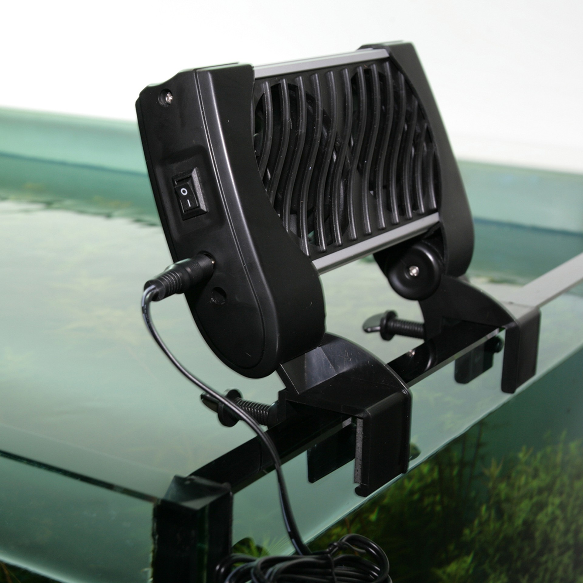 Soğutucu fanın askı aparatını akvaryumun kenarına takın (maksimum 2,5 cm kalınlığa kadar) ve sıkıştırma vidaları ile sabitleyin.