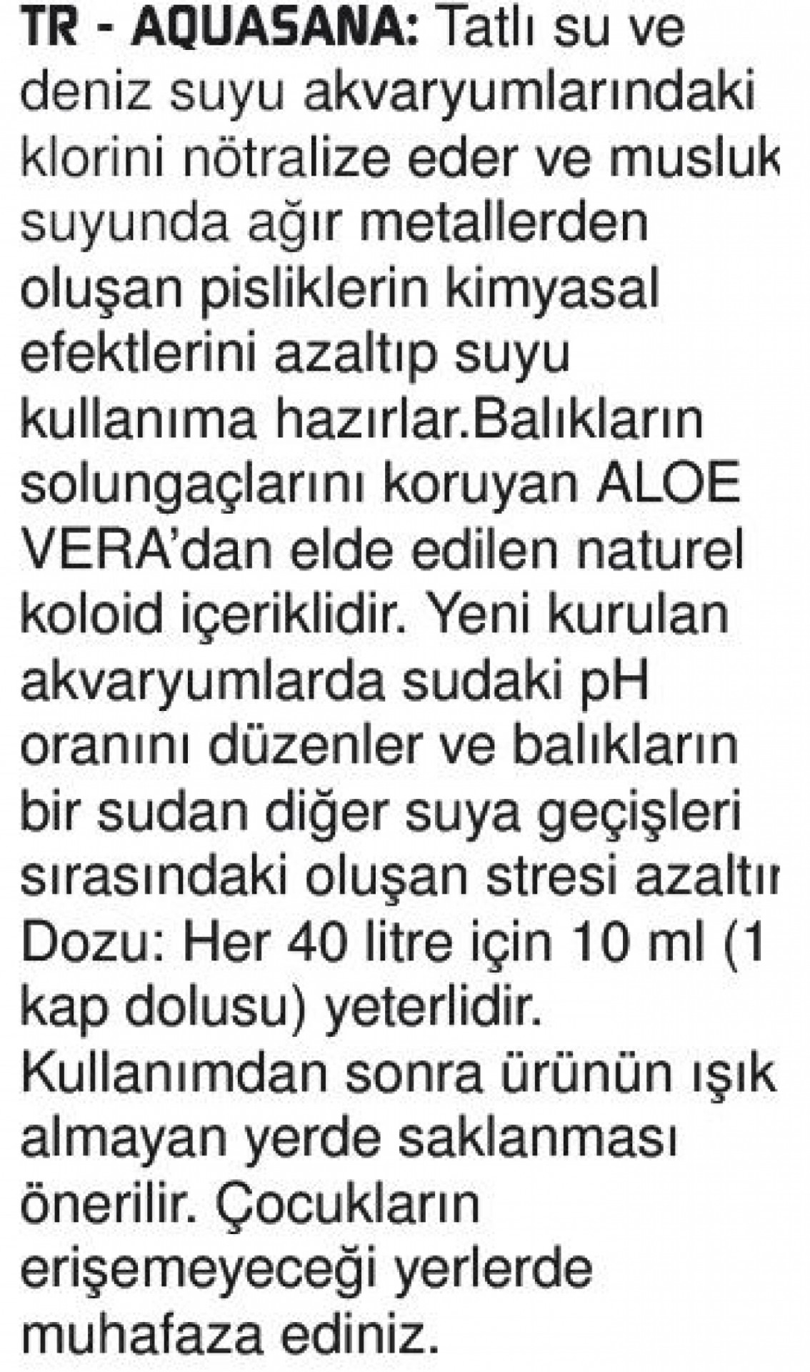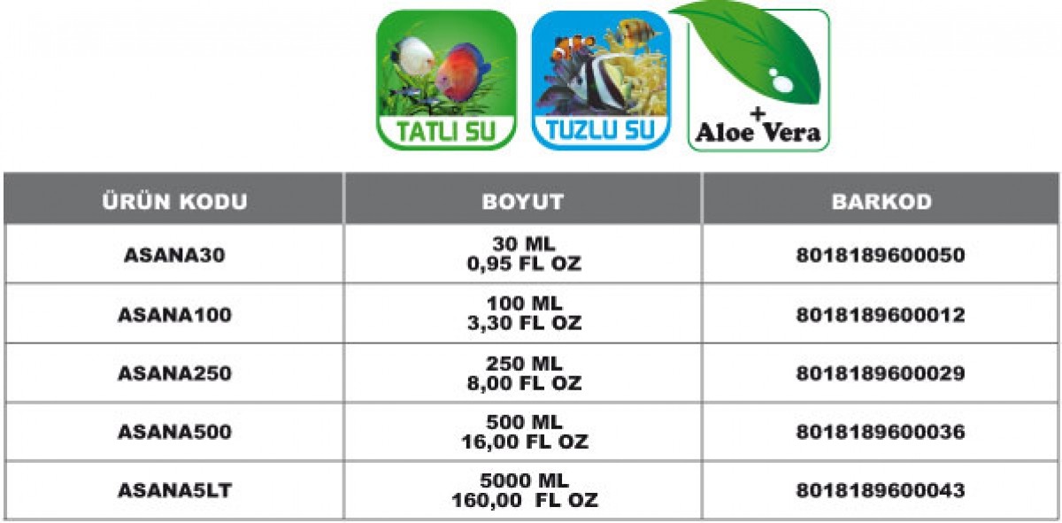 Tatlı ve tuzlu su akvaryumları için musluk suyundaki kloru nötralize edip, ağır metallerin kirletici etkisini azaltıp, suyu balığınız için hazırlayan su düzenleyicisidir. Balığınızın solungaçlarını ve yüzeyini koruyan özel bir koloidal madde olan Aloe Vera ile zenginleştirilmiştir. Aquasana akvaryumunuzu suyla doldurduktan hemen sonra ya da su kısmen değiştirildikten sonra, suyun pH seviyesini sabit tutmak, ideal ve stressiz koşullar yaratmak için kullanılmalıdır.